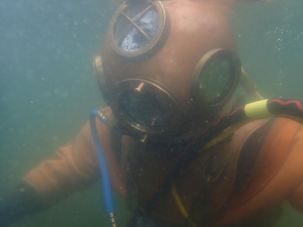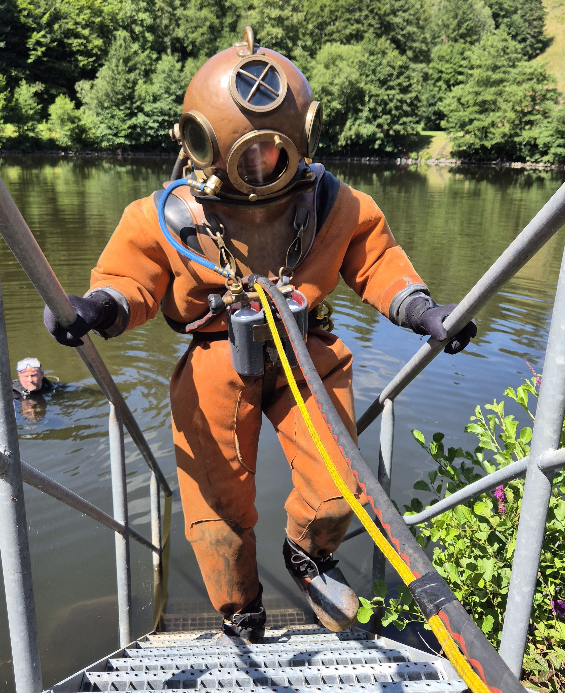 mit historischem Tauchanzügen und drei Bolzen Tauchhelm von Dräger Vorführung im Freibad Redwitz